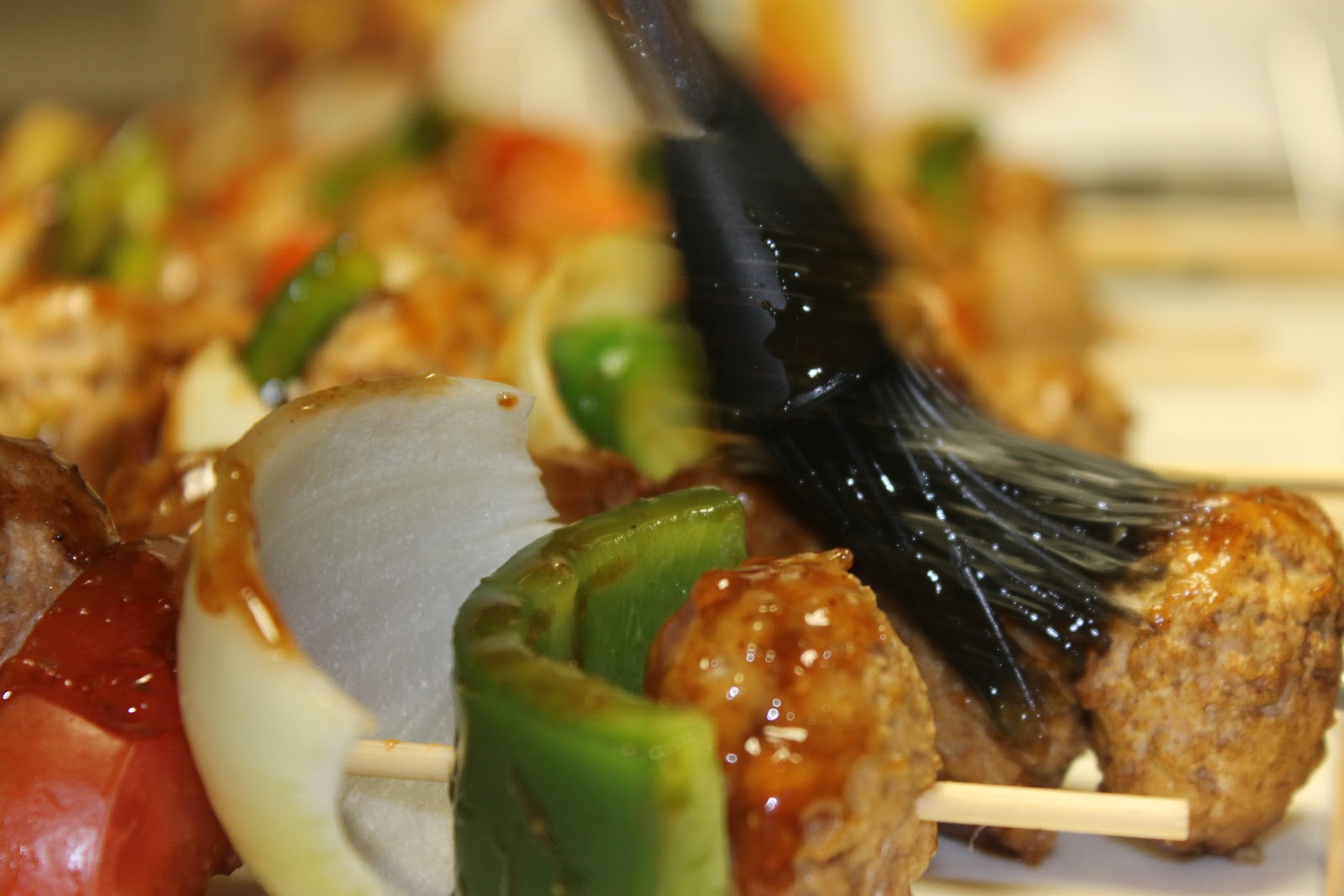 Chop your veggies and assemble on skewers, alternating between veggies and meatballs. Try leaving a little room between the veggies and meatballs to let them cook evenly.